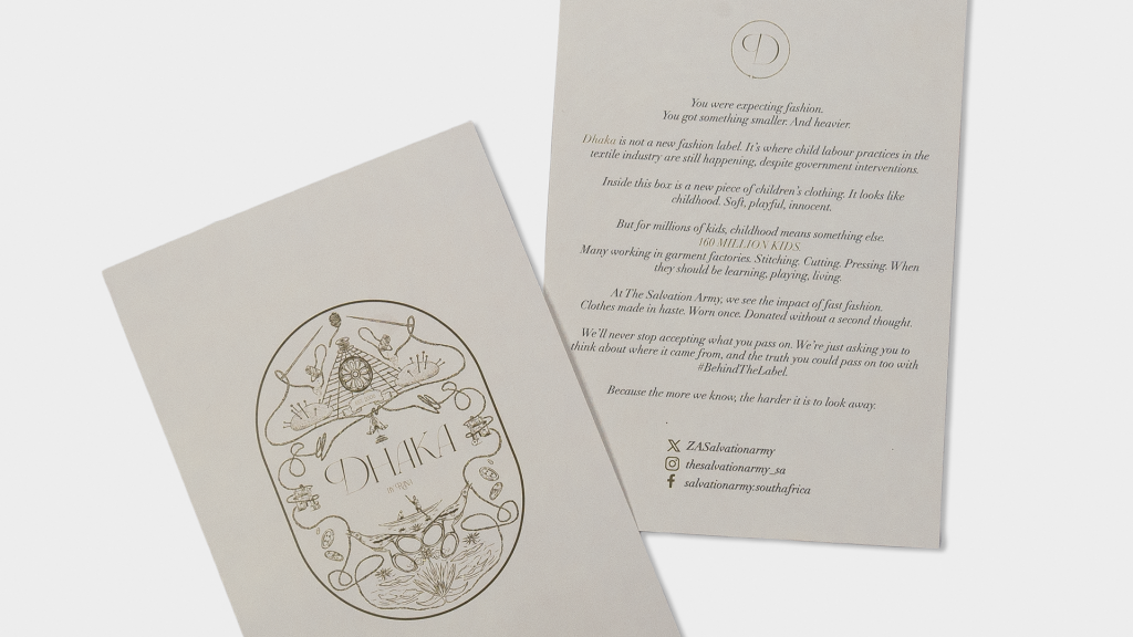 In a provocative new campaign developed in partnership with The Salvation Army, the language of luxury fashion has been turned inside out to expose the exploitation it so often conceals. The campaign, titled #BehindTheLabel, confronts the public with one devastating truth: 160 million children are trapped in child labour globally, many of them working in the fast fashion supply chain.